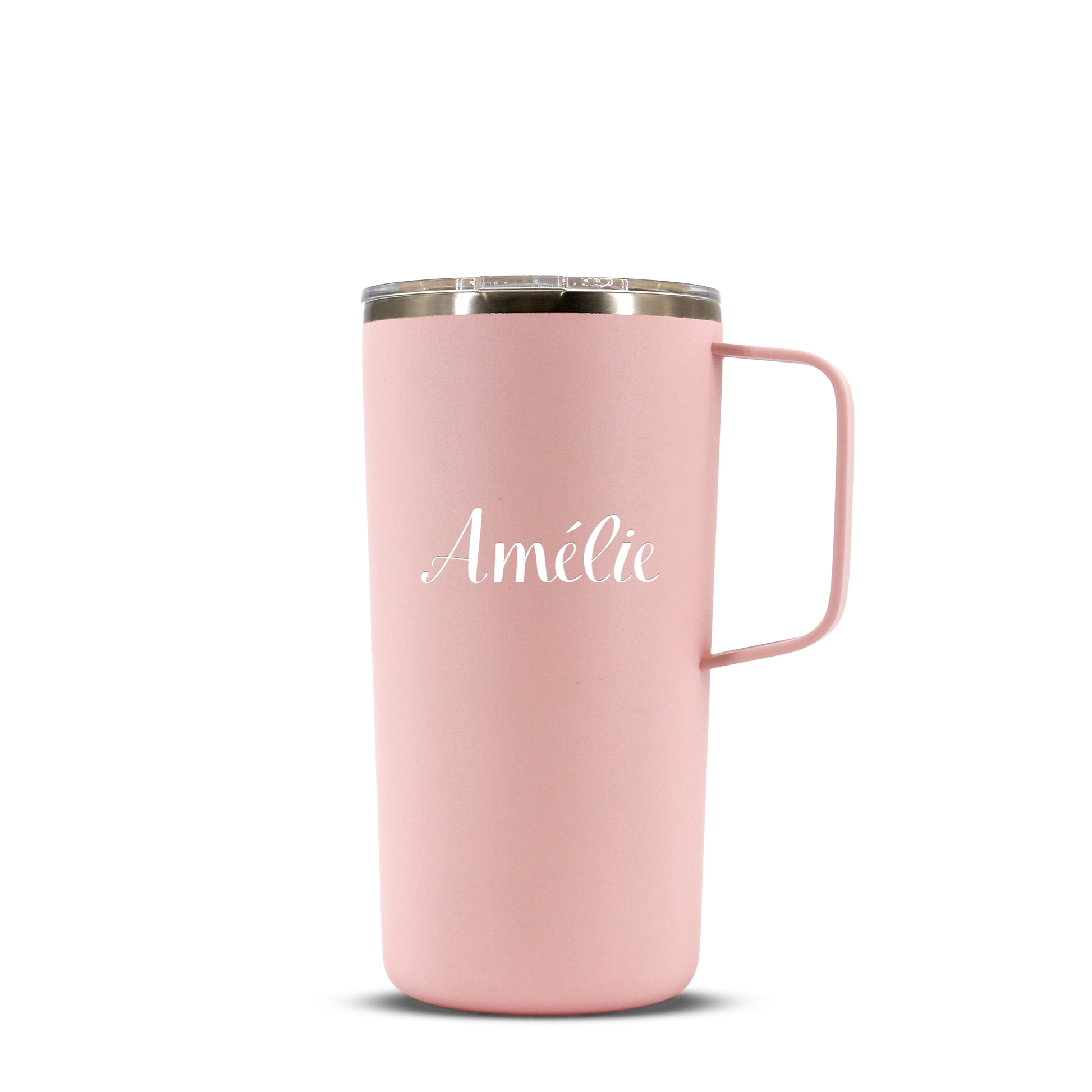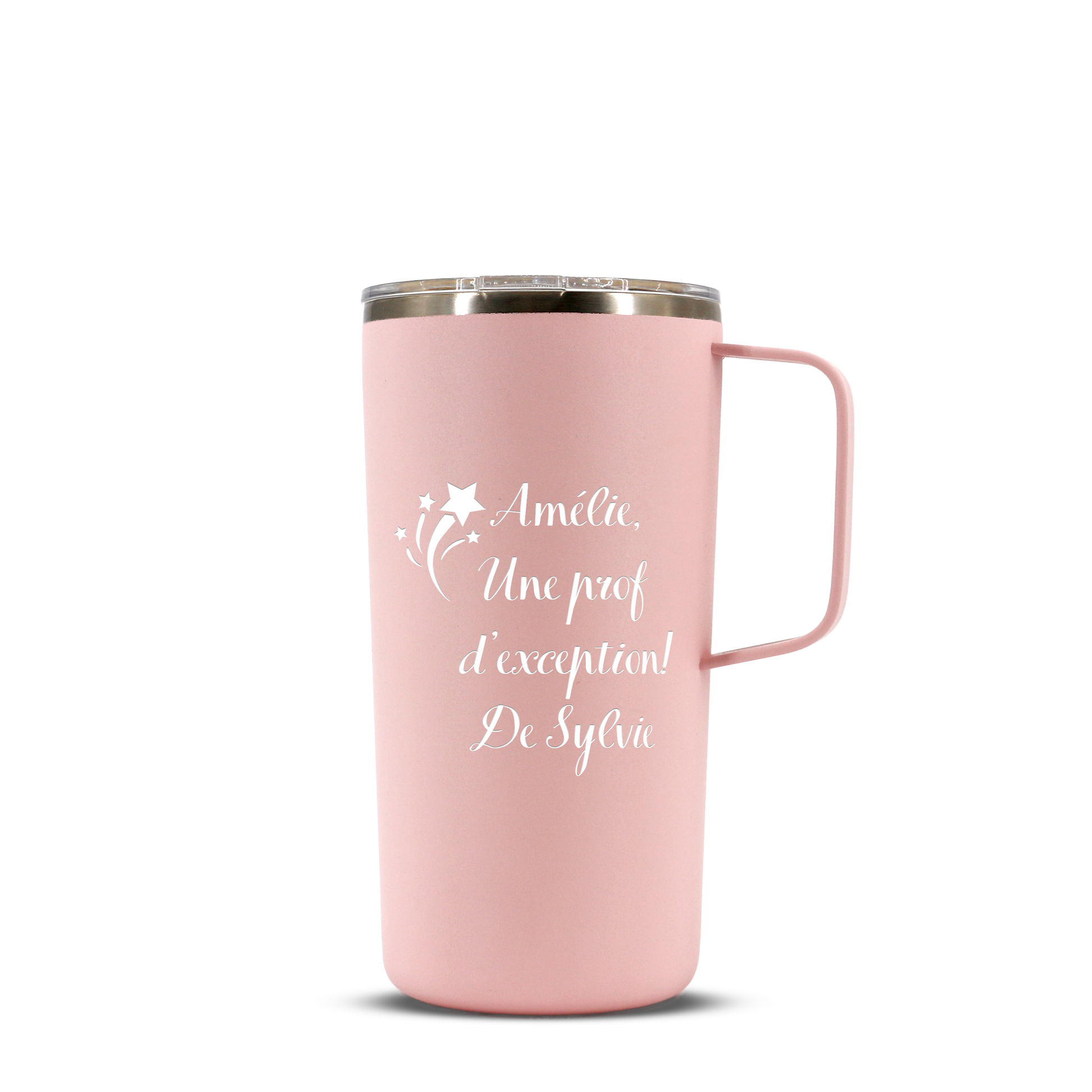 Un petit mot qui réchauffe le cœur… dans une tasse qui garde les boissons bien au chaud ! Offerte en rose ou noir mat, cette tasse en acier inoxydable de qualité supérieure est personnalisée avec le nom de l’enseignant(e) et celui de l’enfant.
